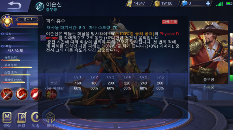 이순신은 궁수이기 때문에 물리피해(Physical Damage)가 중요합니다. 주로 물리공격력과 공격속도를 강화시키는 쪽으로 장비를 챙겨주는게 좋습니다.