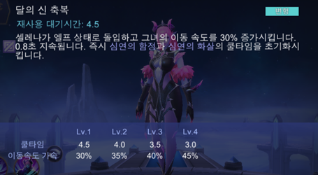 셀레나의 궁의 특징은 쿨타임이 매우 짧다는 것입니다. (4.5초 -> 3초)