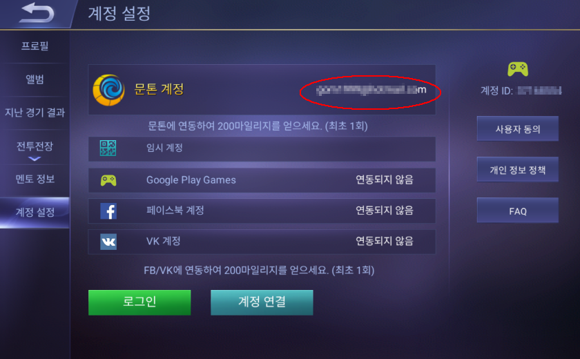 다시 계정설정 화면에서 해당 계정으로 로그인 해보면 이제는 화면 중앙에 "문톤 계정" 부분에 내가 입력한 Email 주소가 나오는 것을 확인할 수 있습니다. 내 MLBB 데이터가 문톤계정과 연동된것을 의미합니다.