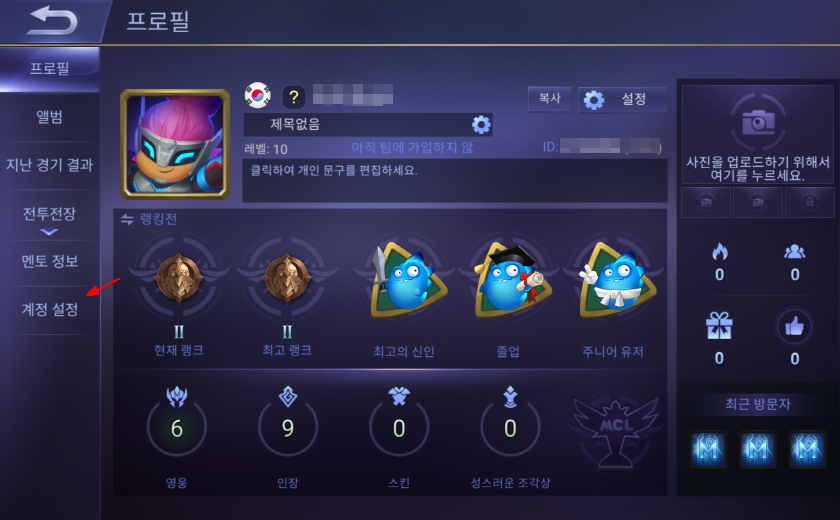 MLBB 메인화면 왼쪽 상단 귀퉁이 아이콘을 눌러서 "프로필" 화면으로 들어갑니다.