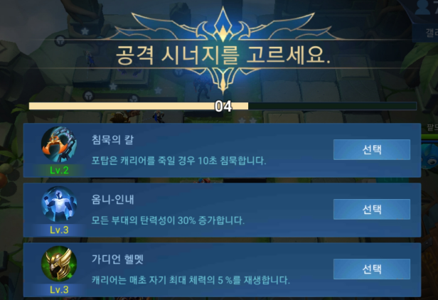 라운드가 끝날때마다 아래와 같이 "공격시너지"를 고르라는 창이 뜹니다.