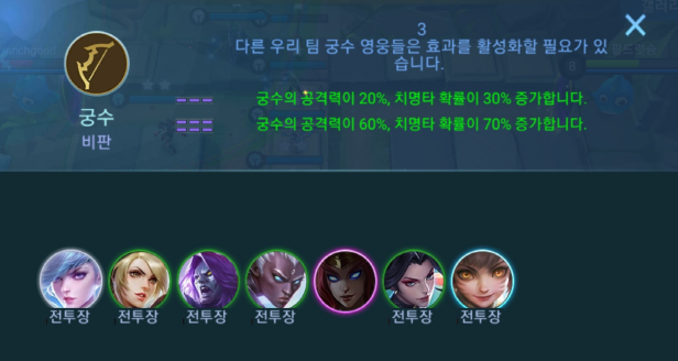 "궁수의 공격력이 60% 증가, 치명타 확률이 70% 증가합니다."