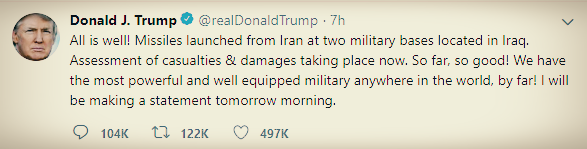(영어공부) 도널드 트럼프 트위터 2020.01.08 일자 - 이란 미사일 공격 본문