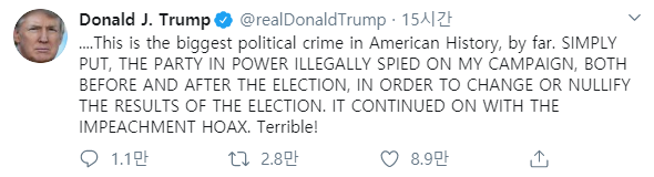 이것은 지금까지 미국 역사상 가장큰 정치적 범죄입니다. 단지 문제를 제기하고, 힘이 있는 정당이 불법적으로 나의 선거운동을 스파이짓 했습니다. 선거전후로다가. 선거결과를 바꾸고 무효화시키려고. 이 짓은 탄핵 사기(거짓말)와 함께 계속 되었습니다. 끔찍하구만요!