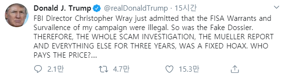 FBI 수장 크리스토퍼 웨이는 FISA 증명서와 나의 선거운동에 대한 감시는 불법이라고 인정했습니다. 가짜 서류도 그렇습니다. 그러므로 3년동안의 모든 스캠(사기) 조사, 뮐러 보고서와 그밖의 모든것들은 분명한 사기였습니다. 이 사회적비용은 누가 치릅니까?