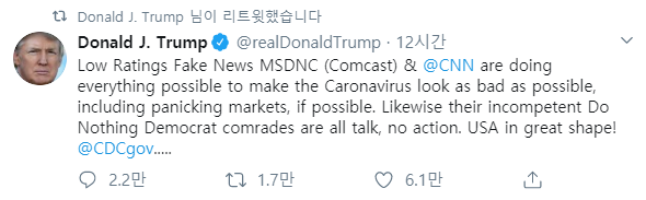 트럼프는 코로나바이러스를 가볍게 생각하고 있는 것 같네요. 쫌 지나면 미국도 난리가 날긴데~~