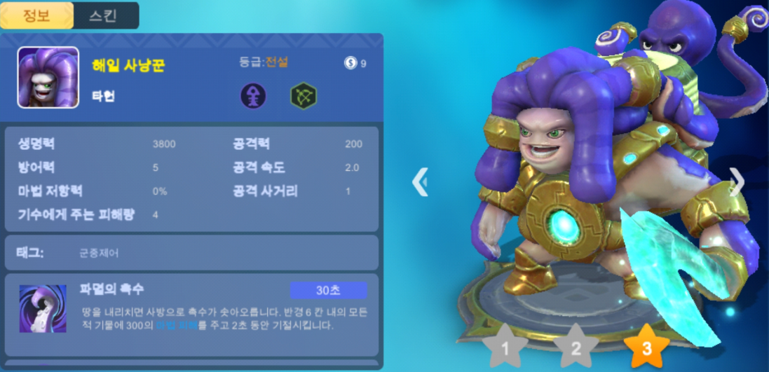 "세이렌(메두사)"은 적들을 3초동안 돌로 만들어버립니다. 그리고, 적들의 공격속도를 20% 감소시키는 효과도 있습니다.