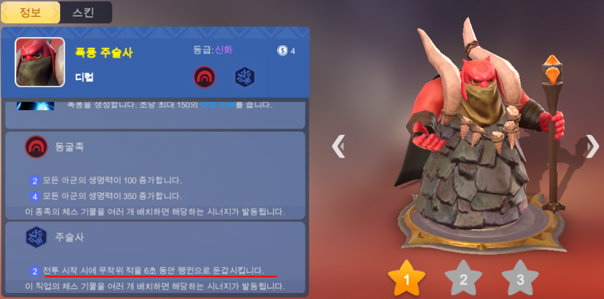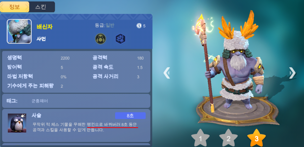 배신자가 1성인 경우에는 10초마다 스킬을 사용할 수 있고, 4초동안 펭귄으로 바꿉니다. 3성이 되면 8초동안 펭귄으로 바꿉니다.