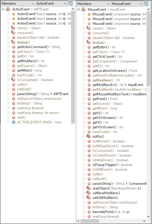 아래 각 클래스에 포함되어 있는 멤버함수 리스트를 보면, ActionEvent 보다는 MouseEvent 쪽이 압도적으로 많습니다.