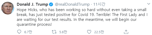 트럼프 대통령, 힉스 보좌관 코로나바이스 감염 - 트럼프 트위터 본문