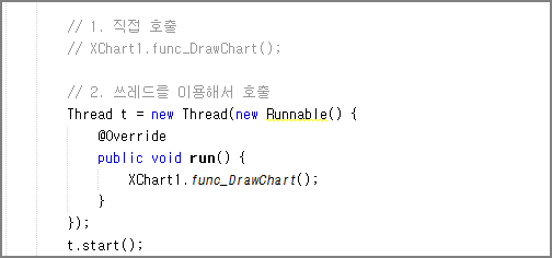 func_DrawChart() 함수 호출하는 부분을 1번처럼 직접 호출하던 것을 2번처럼 쓰레드를 사용해서 호출하는 것으로 변경합니다.
