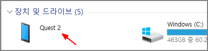 "OOO USB 장치" 라고 나오는 경우도 있고, "Quest 2" 라고 아래처럼 나오는 경우도 있네요~ 접속하는 PC마다 쫌씩 다른 것 같습니다.