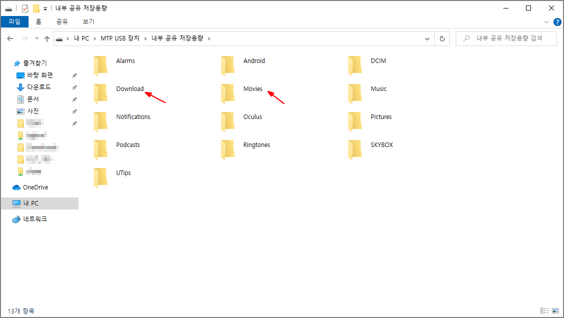 Download 나 Movies 폴더에 파일을 넣으면 기기에서 볼 수 있습니다.