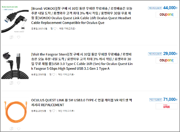 >> 테블릿 충전할때만 사용하던 집에 굴러다니는 싸구려 USB-C 케이블로 오큘러스와 PC를 연결해보니, 아주 잘되네요. 헐~ 굳이 저런 앞에 OCULUS 라고 붙은 비싼거 안 사도 될 것 같습니다. <<