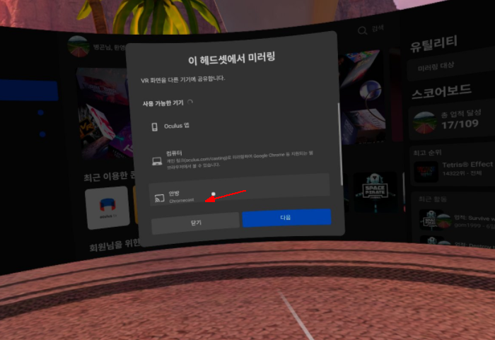 아래처럼, 내가 크롬캐스트에 세팅해놓은 "안방" 이라는 이름이 오큘러스 기기안에서 바로 보입니다.
