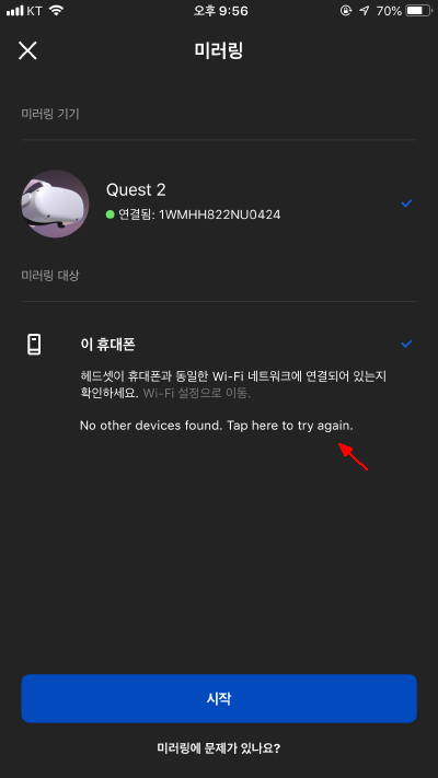 근데, 저는 아래와 같이 "No other devices found. Tap here to try again." 을 아무리 눌러도 내 크롬캐스트4를 못 찾았습니다.