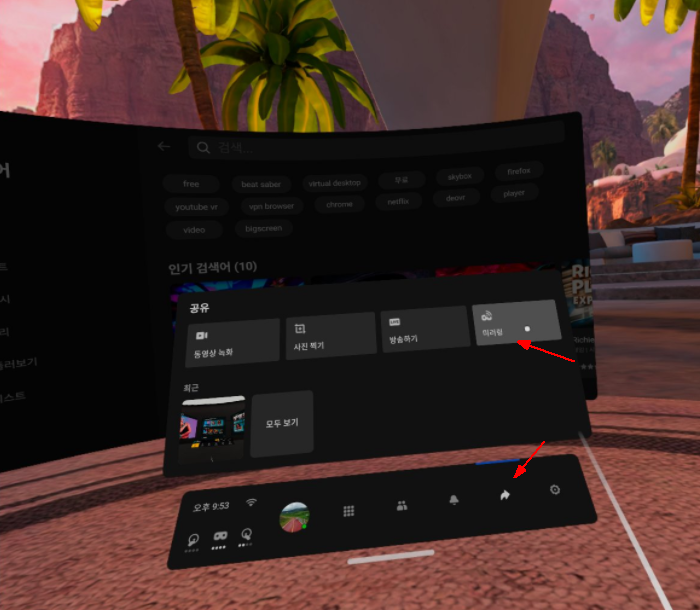 그래서 한참을 헤매다가 오큘러스 VR 기기내에서 "미러링"을 눌러보니까~ 헉^^; 그냥 바로 됩니다.