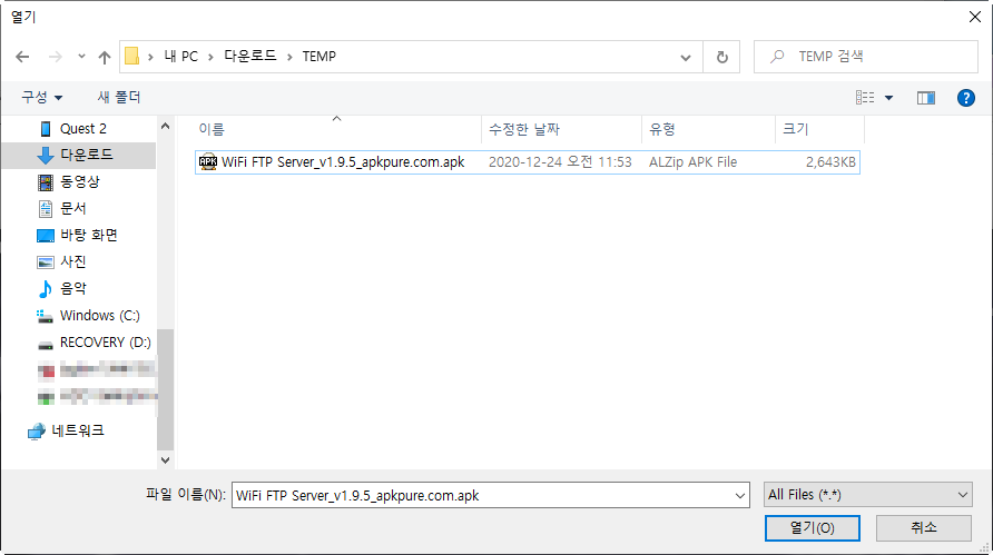 위 블로그에 설명되어 있는데로 SideQuest 가 잘 설치되었다면, 이제는 FTP apk 파일을 구해서 SideQuest 를 이용해서 설치해주면 됩니다.