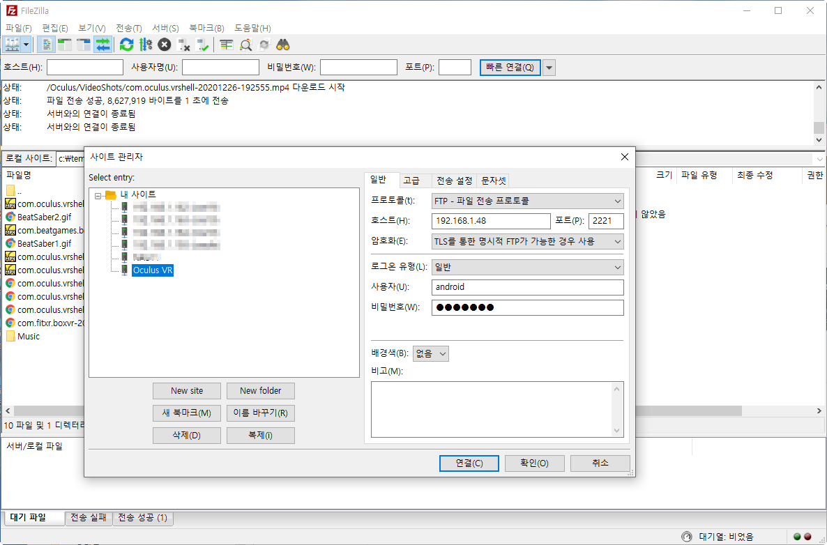 FTP Client 프로그램을 통해서 PC 또는 노트북 에서 오큘러스퀘스트 VR기기로 FTP 접속이 가능합니다.