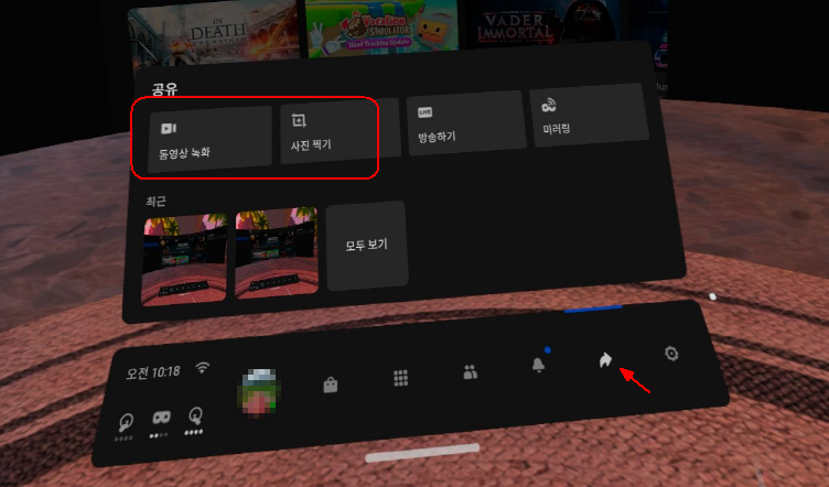 2021. 1. 1. 10:47오큘러스 퀘스트2 VR기기 안에서 화면캡쳐, 동영상 캡쳐를 하고자 할때, 시스템메뉴의 [공유] 메뉴로 들어가면 됩니다.