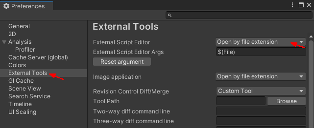 "External Script Editor" 가 "Open by file extension" 으로 되어 있는데,
