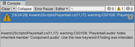 warning CS0108: 'Playerball.audio' hides inherited member 'Component.audio'. Use the new keyword if hiding was intended.