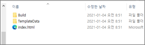 이렇게 WebGL 로 빌드를 하면, 아래처럼 2개의 폴더와 index.html 파일이 생성됩니다.