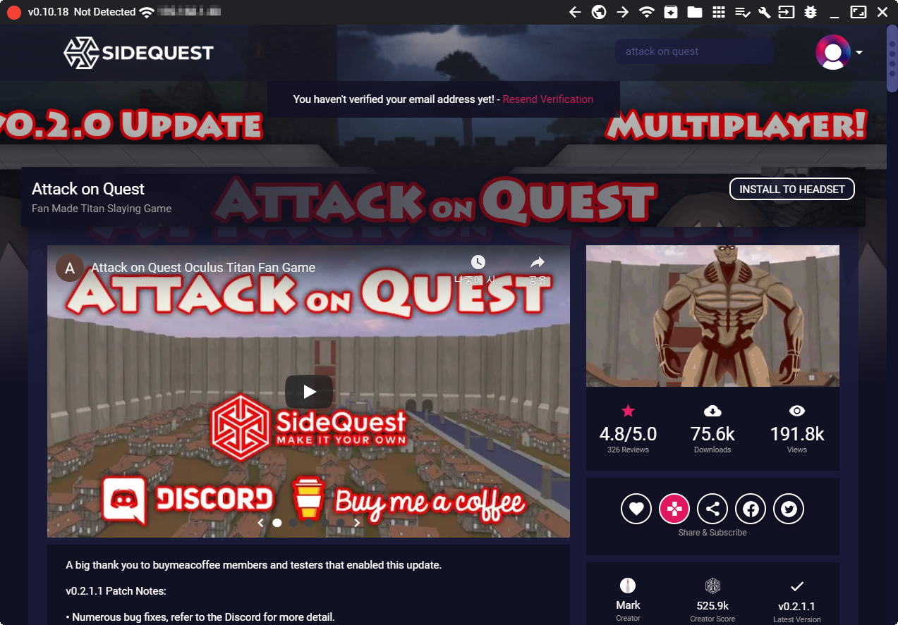 사이드퀘스트에 들어가면 무료로 설치해서 체험해 볼 수 있습니다. 사이드퀘스트에서 "Attack on Quest" 로 검색하면 나옵니다.