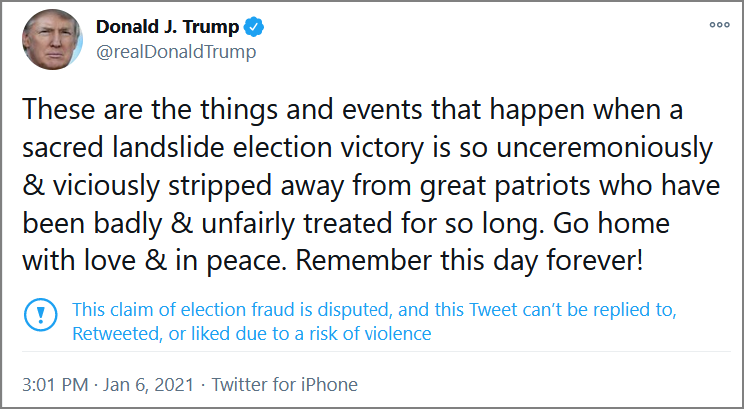 트럼프 트위터 계정이 정지당한 이유는 트럼프를 지지하는 폭도들이 국회의사당에 난입해서 4명이나 죽은 사건에 대해 요런 트위터를 남겨서 였습니다.