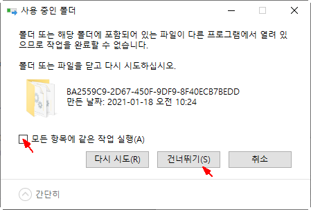 이때, 현재 사용중인 파일들이 있으면 아래처럼 지울 수 없다고 나옵니다. 요런 애들은 [건너뛰기] 눌러서 Skip 해주면 되겠습니다.