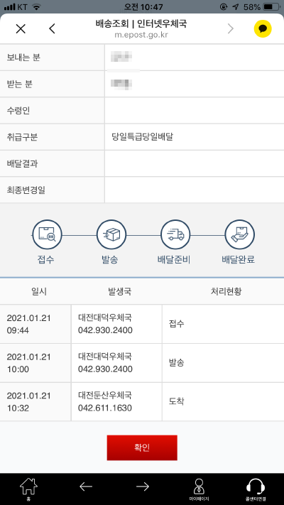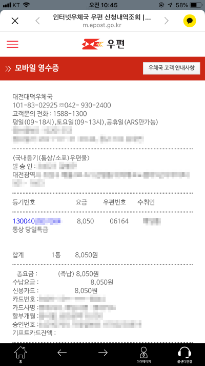 우체국에서 "당일특급" 등기접수가 되고나면 카톡으로 아래와 같은 메시지가 날라옵니다.