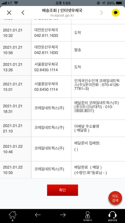 여기에서 등기번호(파란색 13자리 숫자)를 눌러주면 아래처럼 배송현황을 조회할 수 있습니다.