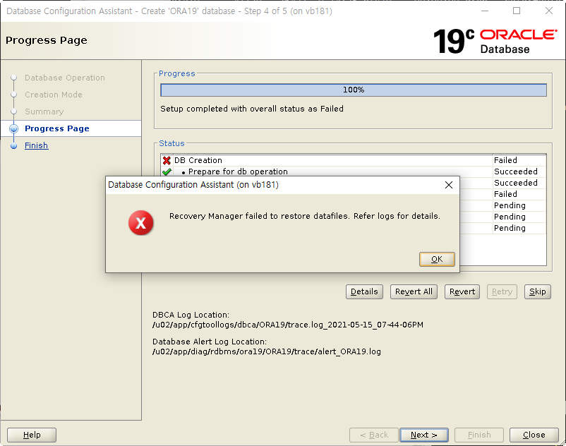 2021. 5. 15. 20:19Oracle Installer 또는 dbca 로 오라클 19c DB 생성시, 아래와 같은 에러를 만날 수 있습니다.