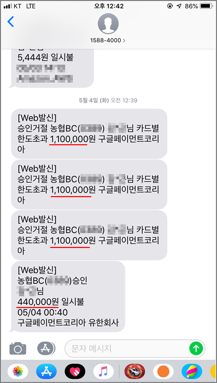 헉, 백십만원을 긁으려고 3번 시도했다가 한도초과로 다 실패하고, 결국 440,000 원을 긁어갔습니다.