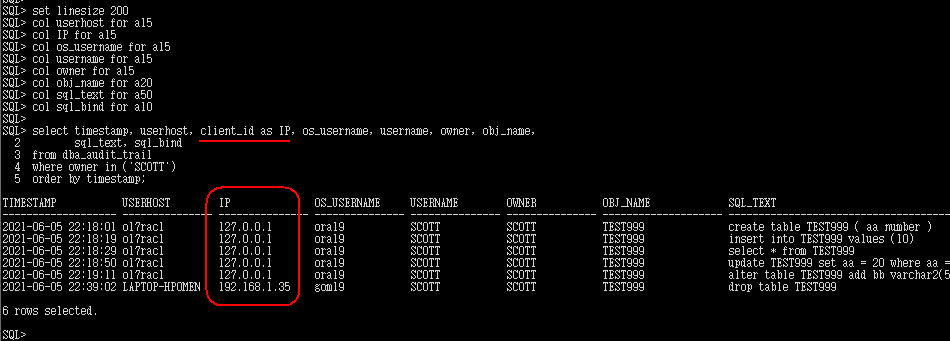 다른 서버에서 SQL*Net 으로 접속해서 실행한 경우에는 해당 Client 의 IP가 제대로 찍힙니다.