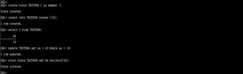 위는 scott 유저에서 TEST999 테이블을 생성하고, 데이터를 Insert, Update 하고, 테이블을 변경하는 것까지 실행한 예입니다. Query, DML, DDL 을 모두 사용했습니다.