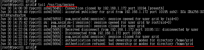 아래처럼, /home/grid 디렉토리의 모드가 bad 해서 거부했다고 나옵니다.
