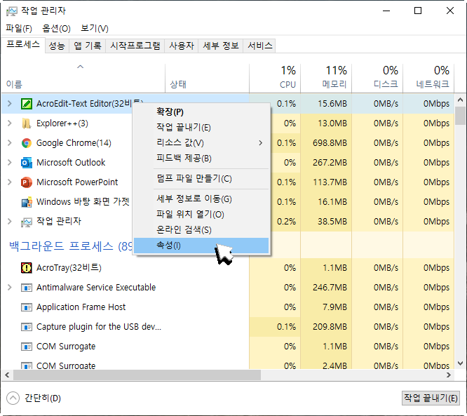 그러면, "속성" 팝업창이 뜨는데, 여기 맨위에 프로세스명이 나옵니다.