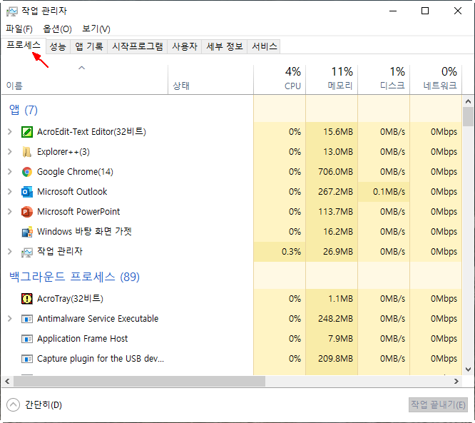 첫번째에 있는 [프로세스]탭에서 실행중인 프로세스를 찾아봅니다. 대부분의 일반적인 프로그램인 경우, "앱" 쪽에 다 나옵니다.