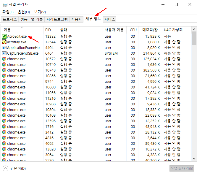만약, 앞에서 [프로세스] 탭에서 찾고자 하는 프로그램을 못찾았다면, 작업관리자 6번째 탭인 [세부정보] 탭으로가면 찾을 수 있습니다. 이쪽에는 실행중인 모든 프로세스의 이름이 바로 나타납니다.