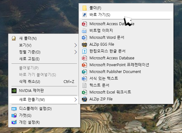 바탕화면에서 마우스 오른쪽 버튼 눌러서 나오는 팝업창에서 [새로 만들기] - [바로 가기] 를 클릭하면 됩니다.