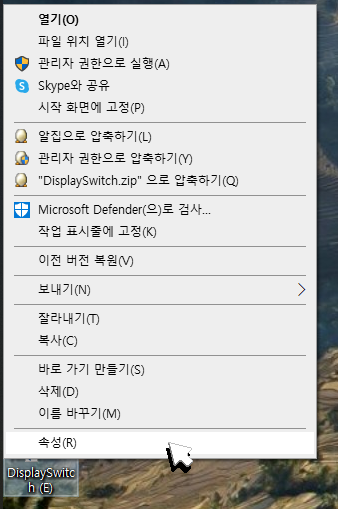 이 아이콘에 대고 마우스 오른쪽 버튼을 눌러서 [속성] 메뉴를 눌러줍니다.
