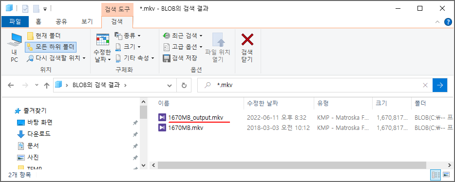탐색기에서 확인해보면, 처음에는 1670MB.mkv 파일만 존재했었고,