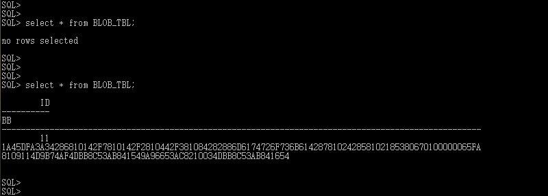 # create table BLOB_TBL ( id NUMBER, bb BLOB ) lob (bb) store as SecureFile;