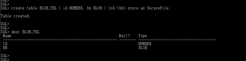 # create table BLOB_TBL ( id NUMBER, bb BLOB ) lob (bb) store as SecureFile;