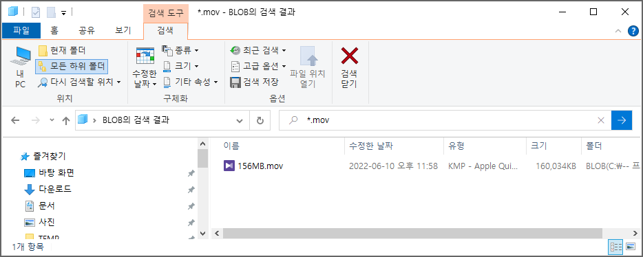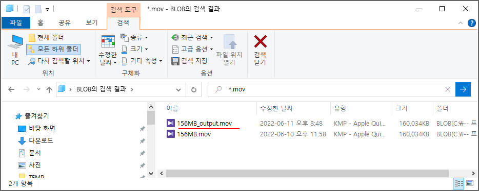 탐색기에서 확인해보면, 처음에는 156MB.mov 파일만 존재했었고,