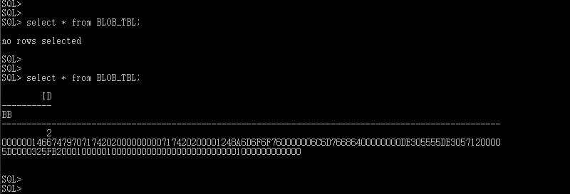 테스트를 위해 아래와 같이 오라클DB 에 미리 BLOB_TBL 이라는 테이블을 만들어두었습니다.