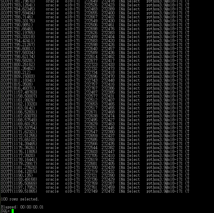 위 파이썬 프로그램을 oracle2.py 로 만들고, 이걸 아래와 같이 nohup 으로 100 개를 동시에 수행하였습니다.