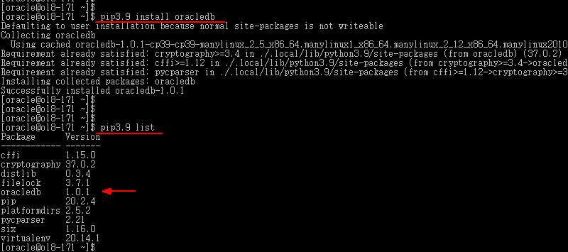 pip3.9 를 사용했기 때문에 python 도 같은 버전을 사용해줘야 합니다. python3.9 를 사용하면 설치된 oracledb 라이브러리를 제대로 사용할 수 있습니다.