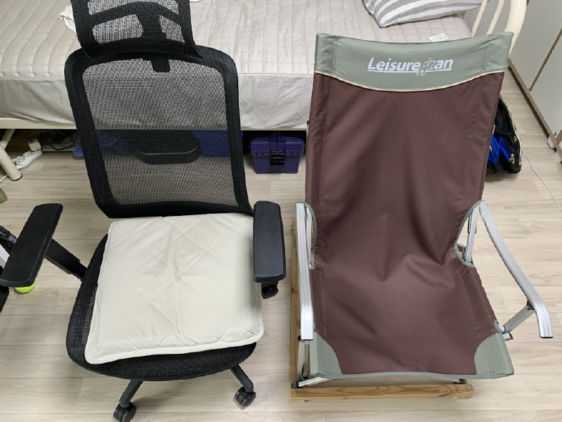 2022. 7. 18. 12:59왼쪽은 매쉬 오피스 의자에 2만5천원짜리 5cm 두께의 라텍스 방석을 얹은것이고, 오른쪽은 캠핑의자에 밑에 받침을 달아서 높이를 올린 것입니다.